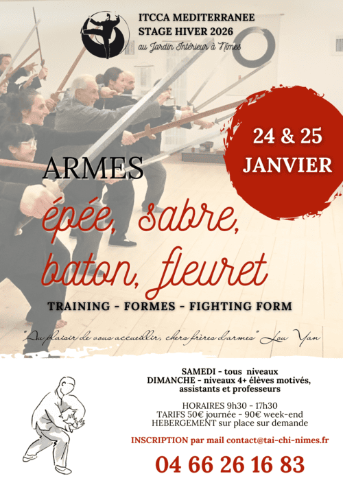 Ce n’est pas si facile de placer notre intention plus loin que notre bras, de l’emmener jusqu’au bout de l’épée ou tout autre arme sans que notre puissance initiale du Dan tian se disperse par des fermetures inconscientes, une mauvaise conduction, une respiration haletante, des émotions inappropriées, qui nous submergent dans le travail à deux.